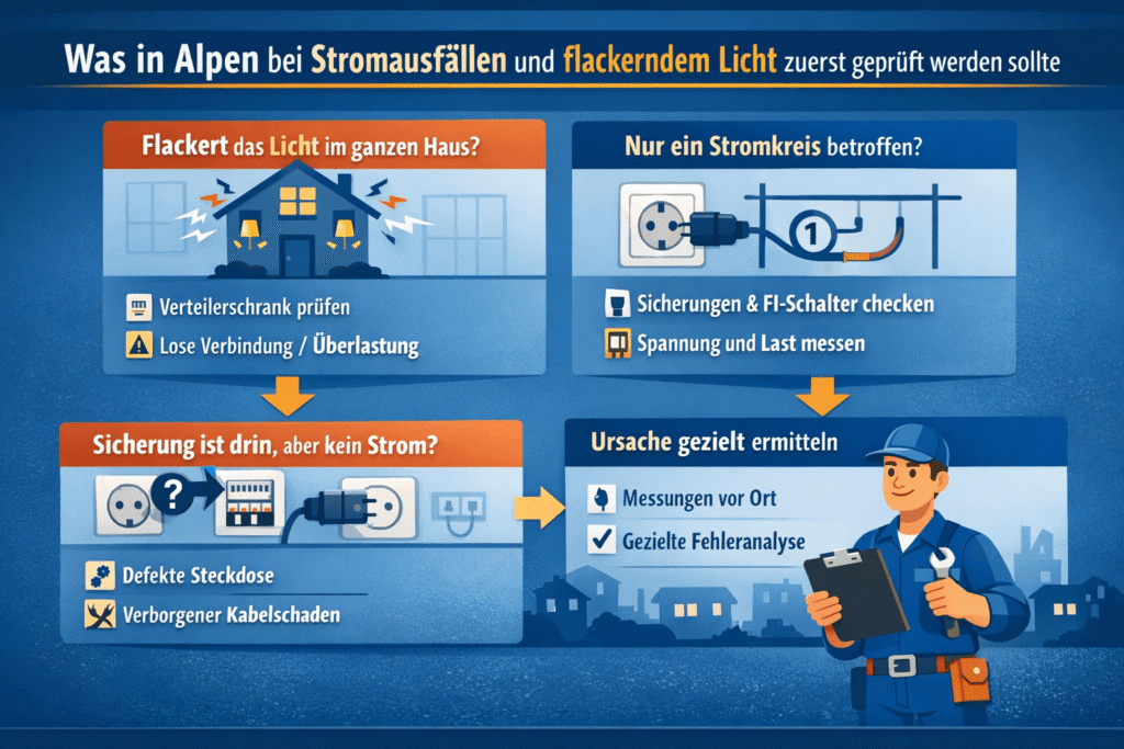 Wenn Licht flackert oder Stromkreise ausfallen, ist zunächst entscheidend, ob die Störung nur einzelne Verbraucher betrifft oder ob die Versorgung im gesamten Objekt in Alpen instabil ist. Wir beginnen vor Ort mit einer klaren Einordnung: Treten die Symptome zeitgleich an mehreren Stellen auf, rückt die Verteilung, eine lose Verbindung oder eine Überlastung in den Fokus.