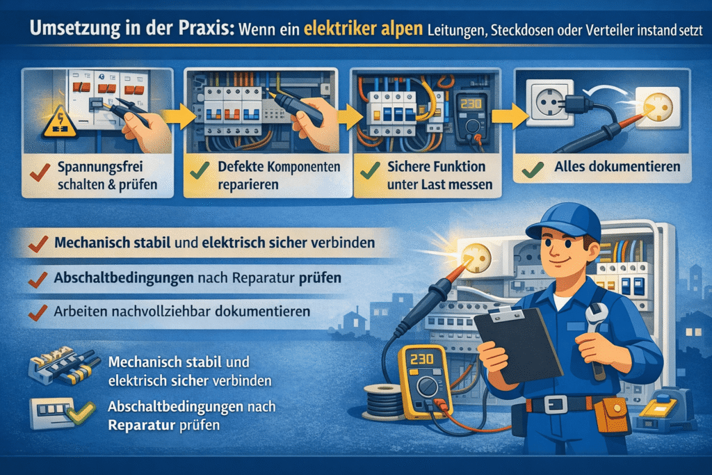 Wenn die Ursache in Alpen gefunden ist, folgt die Instandsetzung so, dass die Schutzfunktion der Anlage erhalten bleibt. Das kann bedeuten, eine geschädigte Steckdose zu ersetzen, eine gelockerte Verbindung neu herzustellen oder einen fehlerhaften Abschnitt im Verteiler zu überarbeiten. Entscheidend ist, dass nicht nur „wieder Strom da ist“, sondern dass die Anlage unter Last stabil arbeitet.