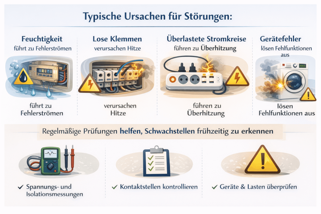 Typische Ursachen für Störungen: Feuchtigkeit, lose Klemmen, überlastete Stromkreise und Gerätefehler