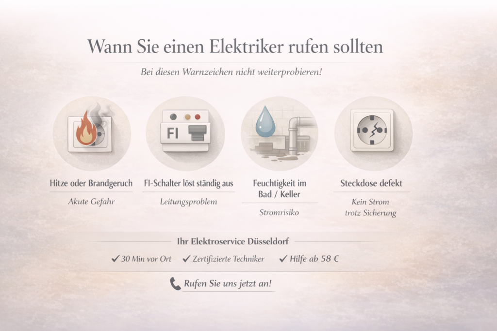 Unser Elektro Reparatur Düsseldorf übernimmt in solchen Fällen die sichere und professionelle Diagnose vor Ort. Wenn Sicherungen oder FI-Schalter wiederholt auslösen, Brandgeruch entsteht oder die Steckdose weiterhin keinen Strom liefert, sollte die Fehlersuche nicht fortgesetzt werden. Unser Elektro Notdienst Düsseldorf arbeitet normgerecht, zuverlässig und ohne Risiko für Sie.